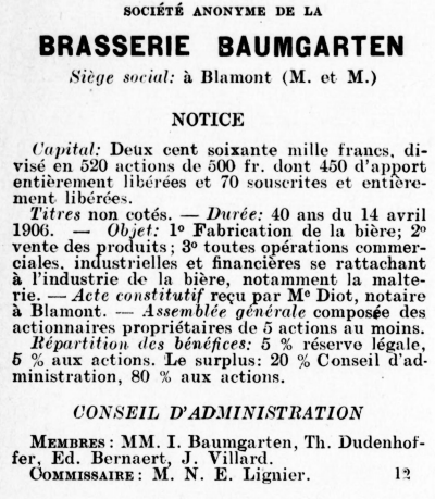du XXème siècle, et crée en 1906 (14 avril) la « Société anonyme de la brasserie Baumgarten » qui